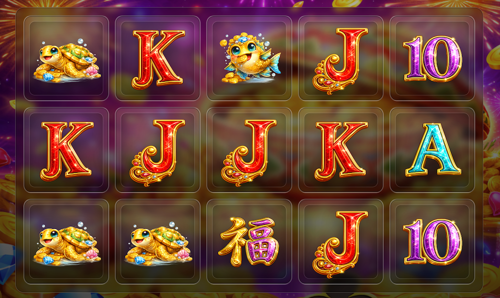 거북이·물고기·게 같은 해양 심볼과 J/K/A/10 카드 심볼, 그리고 행운의 심볼이 함께 등장해 매 스핀마다 화려한 조합 재미를 제공합니다.